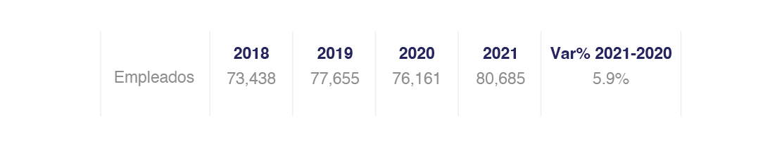 Grupo Carso es fuente de empleo para más de 80 mil personas de planta y eventuales en México, Latinoamérica y algunos países de Europa. Durante 2021 aumentaron 5.9% los empleos en comparación con el año pasado. Los colaboradores del Grupo cuentan con salarios remunerados de acuerdo con las leyes, el mercado, su desempeño, y el nivel de responsabilidad dentro del área de trabajo a la que pertenecen.